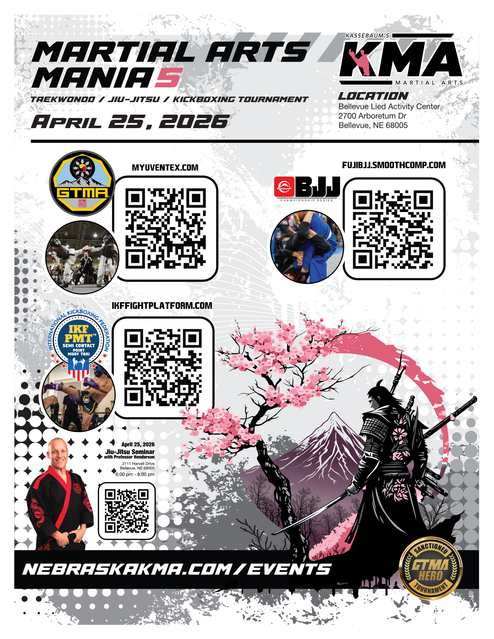 Martial Arts Mania 5 Tournament + Add to Google Calendar + iCal / Outlook export 00 days 00 hours 00 minutes 00 seconds Date Apr 25 2026 Time 8:00 am - 4:00 pm Location Bellevue Leid Activity Center 2700 Arboretum Dr, Bellevue, NE 68005 Category Regional Tournament Organizer Chief Master Kassebaum Phone 402-826-7448 Email cmk@nebraskakma.com Share this event